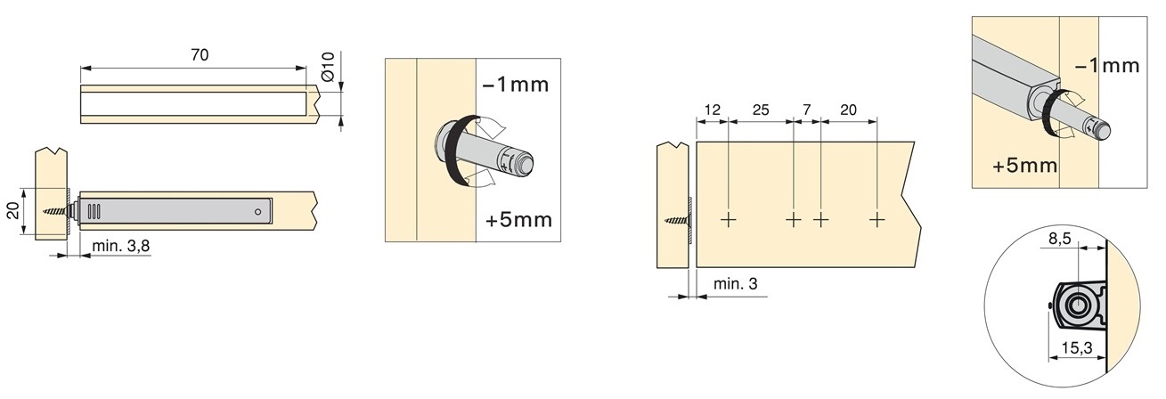 - Afstanden mellem push-to-open døråbneren 1900321 og dørkanten er 12 mm (15/32″) (for flere detaljer, se montagetegning)