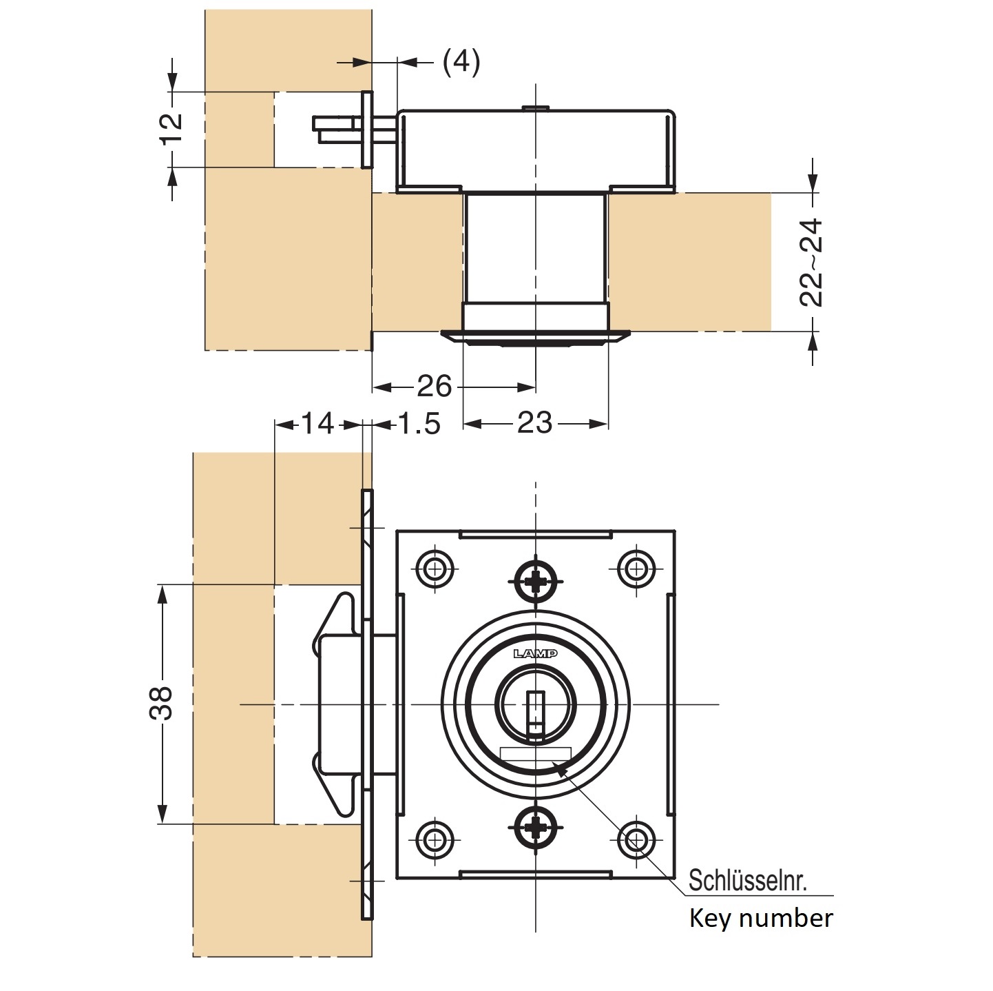 Skydedørslåsen 7810K-24-CR-L-D er en forsænket lås og har en permanent monteret stiftcylinder.
