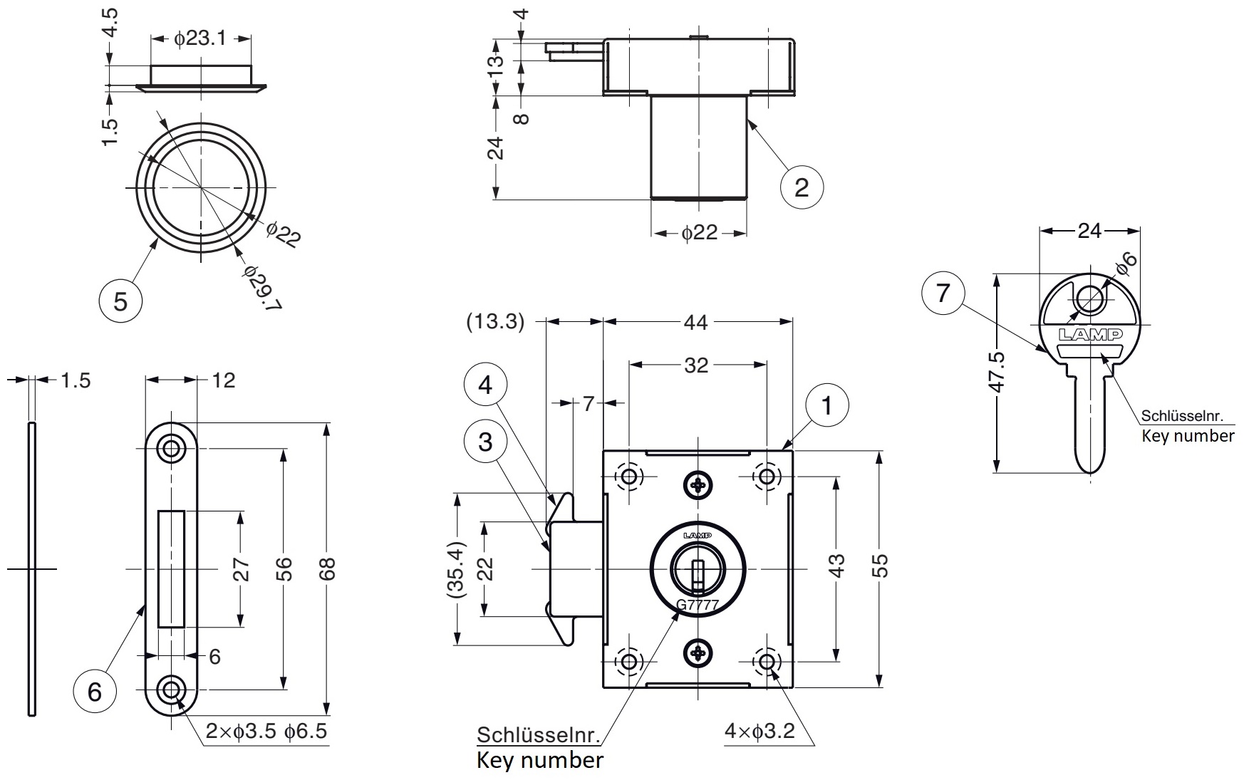 - Højde og bredde på skruedørslåsen: 55 mm (2-11/64″) x 44 mm (1-47/64″)